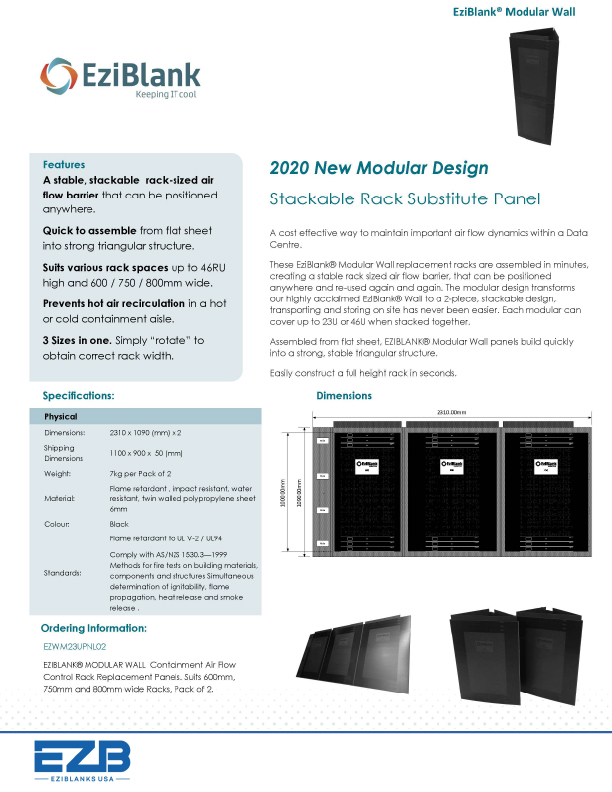 Safety Information: EziBlank Modular Wall is a temporary structure designed as a temporary, removable rack substitute panel for hot/cold aisle air flow management in data centre. The product is not to be used as weight bearing structure under any circumstances and EziBlank will not be responsible for any damage or injury caused by incorrect use of the product. Please refer to EziBlank Safety Information Sheet for more information.
